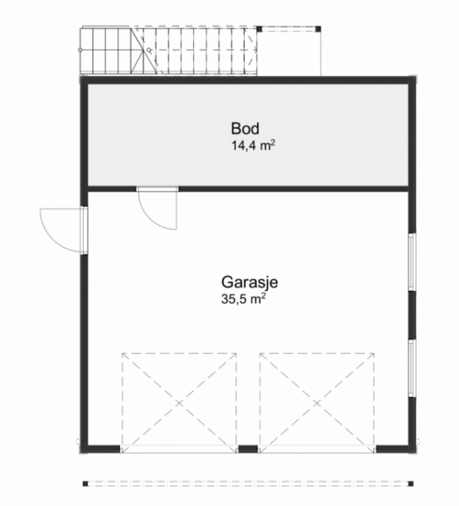 Garasjen inneholder et garasjerom i første etasje med en fradelt bod i bakkant av rommet. Garasjen har to garasjeporter, en praktisk dør i bakkant og vinduer for godt lysinnslipp.